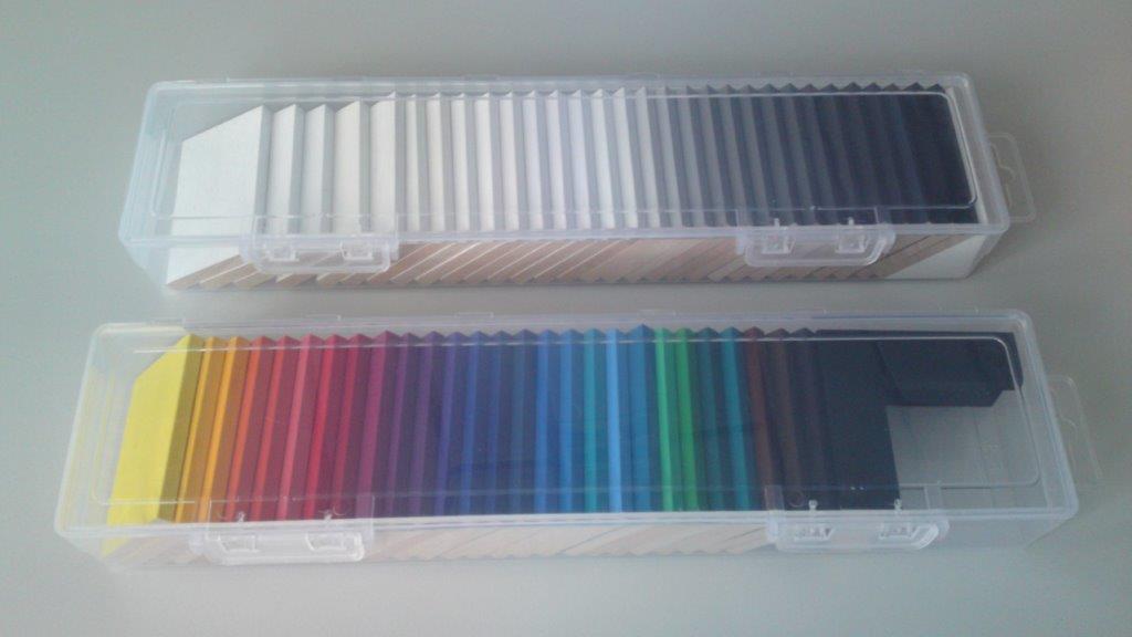 Auf eine Platte passen alle Farbmuster des Wunschfarbensortiments oder alle verfügbaren Rohleisten (siehe Musterset)